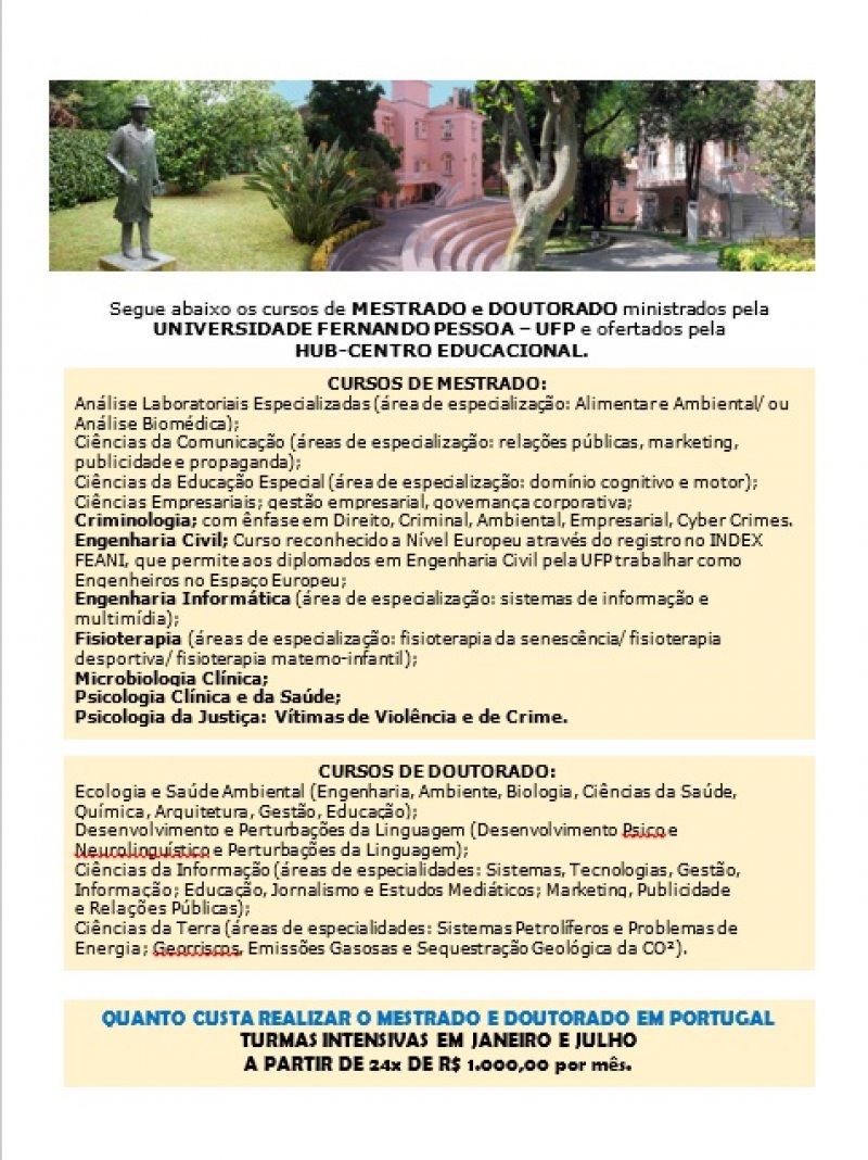 Com o convênio, associados e seus dependentes, terão direito a desconto de 50% na taxa de inscrição para os cursos, ministrados na Universidade Fernando Pessoa (UFP) na cidade do Porto, em Portugal, intermediados pela HUB – CENTRO EDUCACIONAL. Para ter acesso ao benefício, o Oficial deve apresentar declaração de vínculo com a ASSOFEPAR, juntamente com a documentação de avaliação de candidatura.