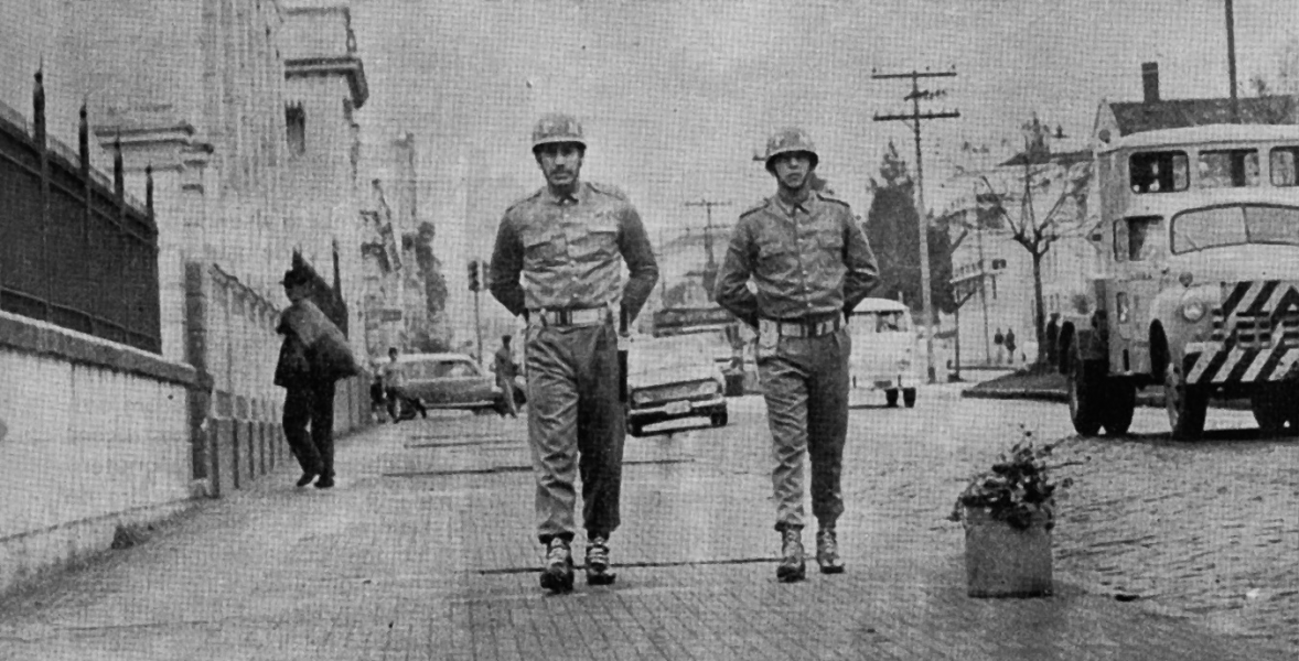 Policiais militares do BG em patrulhamento a pé (Cosme e Damião) em Curitiba na década de 1960. Crédito: Revista da PM, 1967.